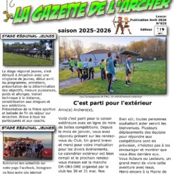 Dans sa robe printanière, voici la gazette de l’archer n° 25.Infos diverses, un peu d’histoire, calendrier des compétitions et photos sont au rendez-vous pour le départ de la saison extérieure.Bientôt distribué dans les boîtes mails des licenciés du Club.Bonne dégustation.Archers je vous salue