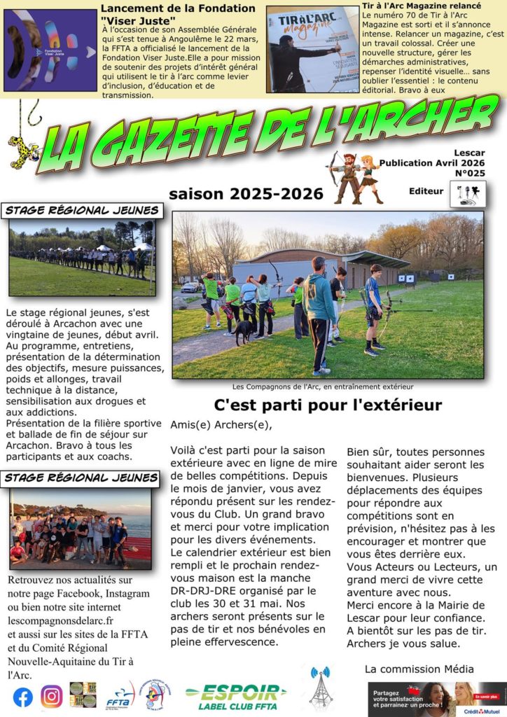 Dans sa robe printanière, voici la gazette de l’archer n° 25.Infos diverses, un peu d’histoire, calendrier des compétitions et photos sont au rendez-vous pour le départ de la saison extérieure.Bientôt distribué dans les boîtes mails des licenciés du Club.Bonne dégustation.Archers je vous salue